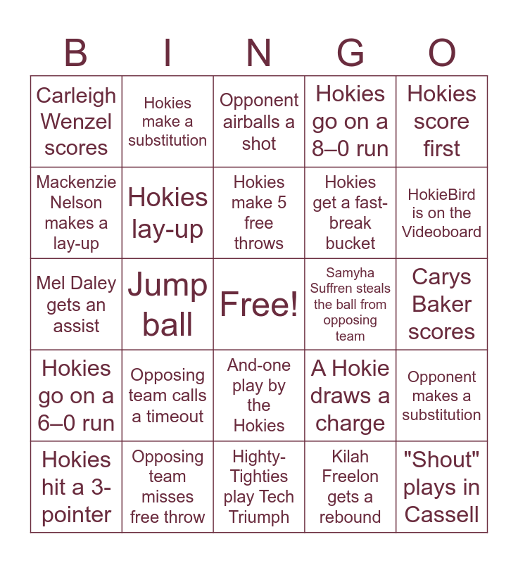 This bingo card has a free space and 29 words: Hokies hit a 3-pointer, Opponent travels, Jump ball, Hokies block shot, Carleigh Wenzel scores, Opponent airballs a shot, Hokies lay-up, Opposing team calls a timeout, Samyha Suffren steals the ball from opposing team, Opposing team misses free throw, Carys Baker scores, "Shout" plays in Cassell, Highty-Tighties play Tech Triumph, Kilah Freelon gets a rebound, HokieBird is on the Videoboard, Hokies forces a shot clock violation, And-one play by the Hokies, Hokies go on a 6–0 run, Hokies score first, Mel Daley gets an assist, A Hokie draws a charge, Opponent picks up a foul, Hokies get a fast-break bucket, Mackenzie Nelson makes a lay-up, Hokies go on a 8–0 run, Hokies make a substitution, Opponent makes a substitution, Hokies make 5 free throws and Leila Wells gets an assist.