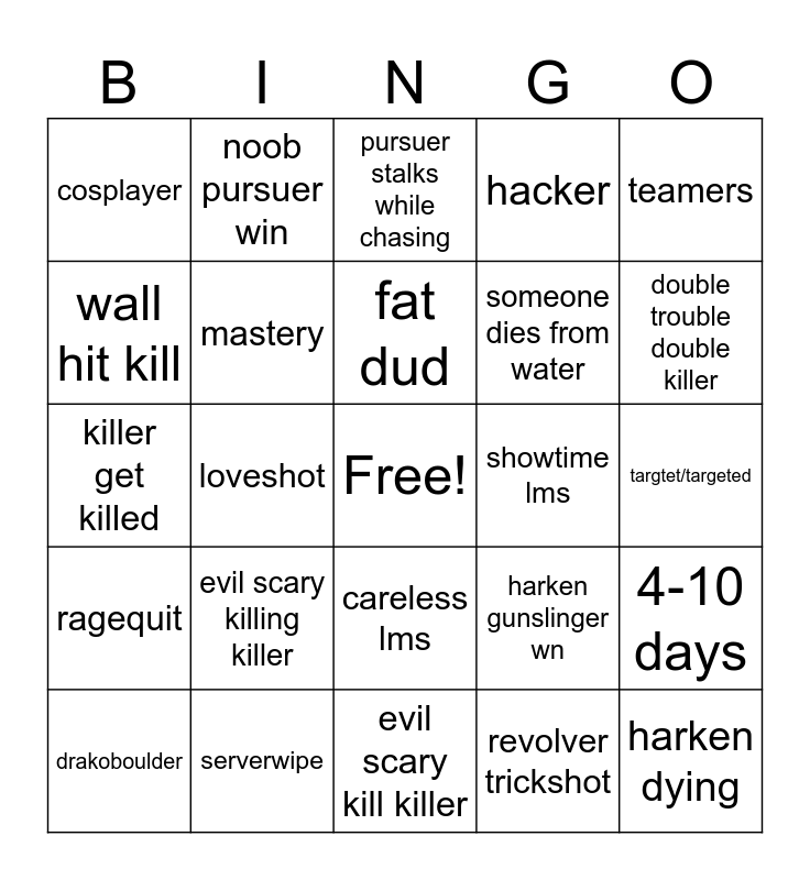 This bingo card has a free space and 24 words: evil scary killing killer, serverwipe, fat dud, drakoboulder, teamers, cosplayer, wall hit kill, noob pursuer win, showtime lms, careless lms, someone dies from water, killer get killed, harken gunslinger wn, 4-10 days, mastery, revolver trickshot, targtet/targeted, pursuer stalks while chasing, double trouble double killer, loveshot, harken dying, ragequit, hacker and evil scary kill killer.
