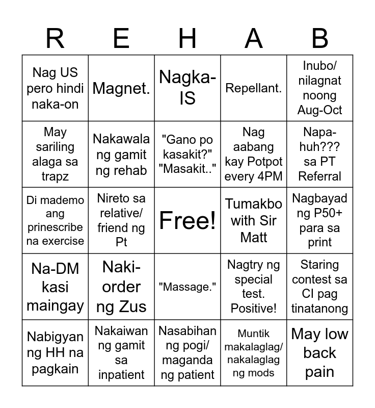 This bingo card has a free space and 29 words: Nabigyan ng HH na pagkain, Nabigyan ng HH na pera, Nireto sa relative/ friend ng Pt, Inaway ng Pt/relative, Nag US pero hindi naka-on, Nagka-IS, Nakawala ng gamit ng rehab, Naki-order ng Zus, Tumakbo with Sir Matt, Nakaiwan ng gamit sa inpatient, Nagbayad ng P50+ para sa print, May low back pain, Nasabihan ng pogi/ maganda ng patient, Muntik makalaglag/ nakalaglag ng mods, Napa-huh??? sa PT Referral, Tinanong ng Pt na di mo masagot, "Massage.", Na-DM kasi maingay, Inubo/ nilagnat noong Aug-Oct, Di mademo ang prinescribe na exercise, Nagtry ng special test. Positive!, Kailangan din i-PT, Nag aabang kay Potpot every 4PM, May sariling alaga sa trapz, Repellant., Magnet., Staring contest sa CI pag tinatanong, "Gano po kasakit?" "Masakit.." and Nag tecar pero di nalagay ang plate.