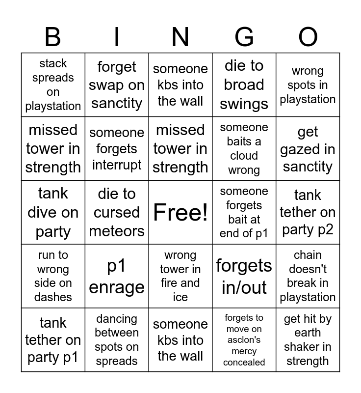 This bingo card has a free space and 24 words: p1 enrage, dancing between spots on spreads, missed tower in strength, tank tether on party p1, wrong spots in playstation, stack spreads on playstation, missed tower in strength, forget swap on sanctity, someone forgets bait at end of p1, wrong tower in fire and ice, someone baits a cloud wrong, tank dive on party, forgets in/out, chain doesn't break in playstation, someone forgets interrupt, forgets to move on asclon's mercy concealed, tank tether on party p2, someone kbs into the wall, get gazed in sanctity, die to cursed meteors, get hit by earth shaker in strength, run to wrong side on dashes, die to broad swings and someone kbs into the wall.