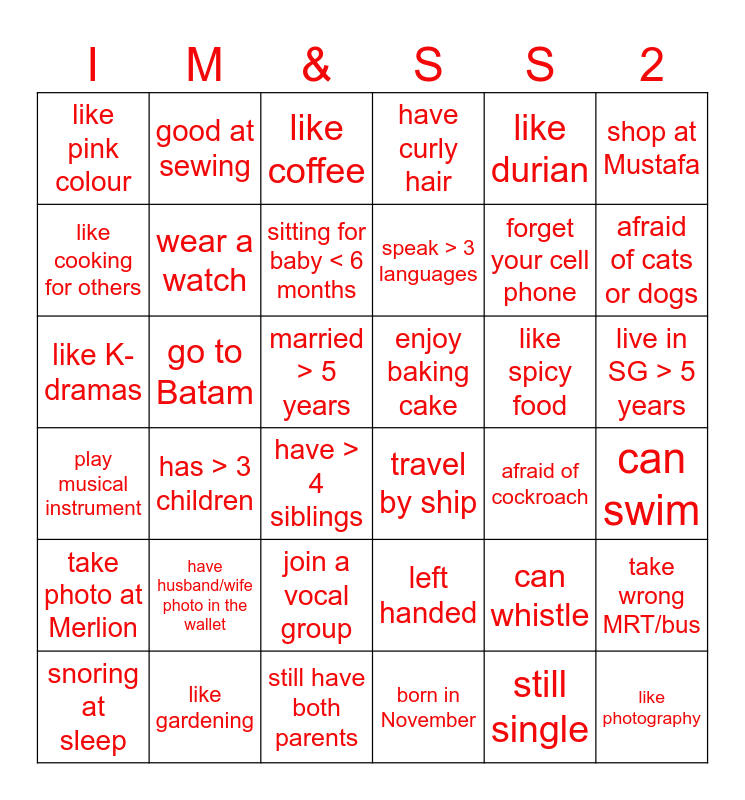This bingo card has 42 words: still single, wear a watch, like black color, like spicy food, can swim, has > 3 children, like K-dramas, wear reading glasses, like coffee, live in SG > 5 years, married > 5 years, speak > 3 languages, afraid of cats or dogs, like durian, like gardening, play musical instrument, take wrong MRT/bus, forget your cell phone, like photography, good at sewing, shop at Mustafa, join a vocal group, take photo at Merlion, like pink colour, like instant noodle, snoring at sleep, sitting for baby < 6 months, hangout in Payalebar, have husband/wife photo in the wallet, can whistle, have a tattoo, enjoy baking cake, like cooking for others, afraid of cockroach, still have both parents, have > 4 siblings, travel by ship, go to Batam, left handed, born in November, have curly hair and have Instagram.