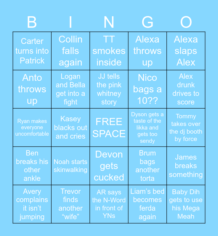 This bingo card has a free space and 24 words: Noah starts skinwalking, Trevor finds another “wife”, JJ tells the pink whitney story, Avery complains it isn’t jumping, Alexa slaps Alex, Carter turns into Patrick, Anto throws up, Collin falls again, Dyson gets a taste of the likka and gets too sendy, Devon gets cucked, Nico bags a 10??, Ryan makes everyone uncomfortable, Brum bags another torta, James breaks something, Logan and Bella get into a fight, Liam’s bed becomes ferda again, Tommy takes over the dj booth by force, TT smokes inside, Alex drunk drives to score, Kasey blacks out and cries, Baby Dih gets to use his Mega Meah, Ben breaks his other ankle, Alexa throws up and AR says the N-Word in front of YNs.