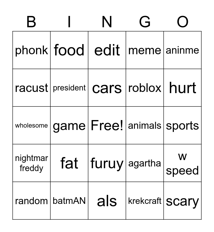 This bingo card has a free space and 24 words: fat, batmAN, cars, random, aninme, phonk, racust, food, animals, furuy, roblox, wholesome, agartha, w speed, president, krekcraft, sports, edit, hurt, game, scary, nightmar freddy, meme and als.
