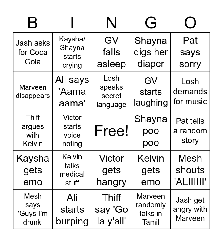 This bingo card has a free space and 24 words: Kelvin talks medical stuff, Ali starts burping, Losh speaks secret language, Mesh says 'Guys I'm drunk', Pat says sorry, Jash asks for Coca Cola, Marveen disappears, Kaysha/ Shayna starts crying, Shayna poo poo, Victor gets hangry, GV starts laughing, Thiff argues with Kelvin, Kelvin gets emo, Mesh shouts 'ALIIIIII', Ali says 'Aama aama', Marveen randomly talks in Tamil, Pat tells a random story, GV falls asleep, Losh demands for music, Victor starts voice noting, Jash get angry with Marveen, Kaysha gets emo, Shayna digs her diaper and Thiff say 'Go la y'all'.