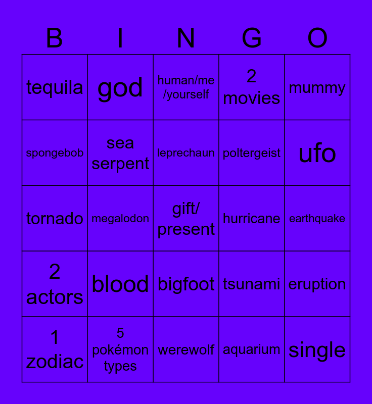 This bingo card has 25 words: blood, werewolf, leprechaun, 1 zodiac, mummy, tequila, spongebob, god, hurricane, bigfoot, poltergeist, tornado, tsunami, eruption, sea serpent, single, earthquake, human/me /yourself, ufo, megalodon, gift/ present, 5 pokémon types, 2 actors, 2 movies and aquarium.