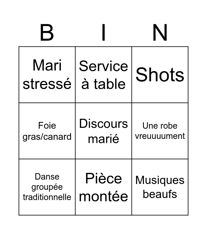 This bingo card has a free space and 8 words: Une robe vreuuuument, Shots, Service à table, Danse groupée traditionnelle, Mari stressé, Musiques beaufs, Foie gras/canard and Pièce montée.
