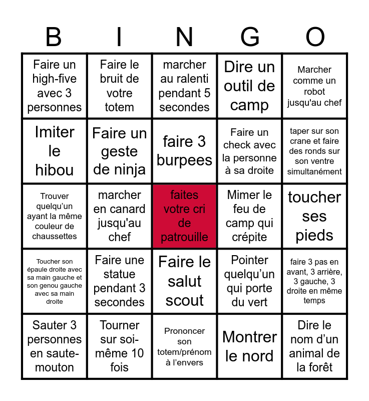 This bingo card has a free space and 24 words: Faire une statue pendant 3 secondes, Tourner sur soi-même 10 fois, faire 3 burpees, Sauter 3 personnes en saute-mouton, Marcher comme un robot jusqu'au chef, Faire un high-five avec 3 personnes, Imiter le hibou, Faire le bruit de votre totem, Mimer le feu de camp qui crépite, Faire le salut scout, Faire un check avec la personne à sa droite, Trouver quelqu’un ayant la même couleur de chaussettes, Pointer quelqu’un qui porte du vert, faire 3 pas en avant, 3 arrière, 3 gauche, 3 droite en même temps, Faire un geste de ninja, Montrer le nord, toucher ses pieds, marcher au ralenti pendant 5 secondes, taper sur son crane et faire des ronds sur son ventre simultanément, marcher en canard jusqu'au chef, Dire le nom d’un animal de la forêt, Toucher son épaule droite avec sa main gauche et son genou gauche avec sa main droite, Dire un outil de camp and Prononcer son totem/prénom à l’envers.