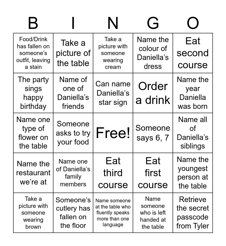 This bingo card has a free space and 29 words: Take a picture with someone wearing brown, Daniella becomes emotional, Someone asks to try your food, Take a picture of Daniella, Food/Drink has fallen on someone’s outfit, leaving a stain, Take a picture with someone wearing cream, Name of one of Daniella’s friends, Name one of Daniella’s family members, Someone says 6, 7, Someone’s cutlery has fallen on the floor, Name all of Daniella’s siblings, Retrieve the secret passcode from Tyler, Name someone at the table who fluently speaks more than one language, Name someone who is left handed at the table, Name the year Daniella was born, Shout ‘Surprise’, Eat third course, Name the restaurant we’re at, Eat second course, Name one type of flower on the table, Eat first course, Name Daniella’s grandparents at the table, Order a drink, The party sings happy birthday, Name the colour of Daniella’s dress, Take a picture of the table, Name the youngest person at the table, Can name Daniella’s star sign and Can name Daniella’s hair type.