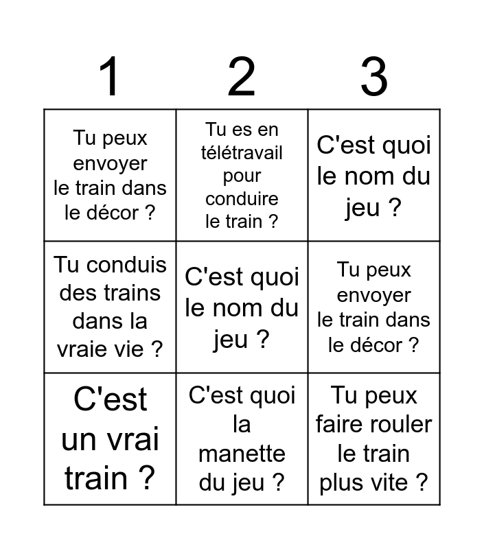 ⚠ This card has duplicate items: Tu peux faire rouler le train plus vite ? (2), C'est quoi le nom du jeu ? (2), Tu peux envoyer le train dans le décor ? (3), C'est quoi la manette du jeu ? (3)