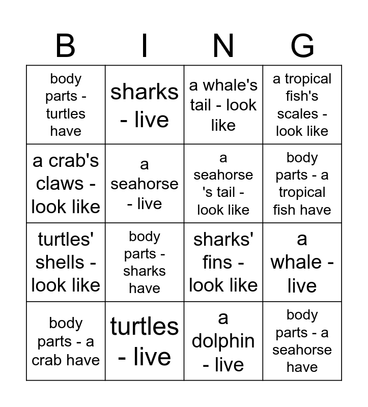 This bingo card has 20 words: a whale - live, body parts - a whale have, a whale's tail - look like, a crab - live, body parts - a crab have, a crab's claws - look like, turtles - live, body parts - turtles have, turtles' shells - look like, sharks - live, body parts - sharks have, sharks' fins - look like, a seahorse - live, body parts - a seahorse have, a seahorse 's tail - look like, a tropical fish - live, body parts - a tropical fish have, a tropical fish's scales - look like, a dolphin - live and body part - a dolphin have.