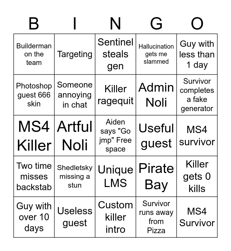 This bingo card has a free space and 24 words: Shedletsky missing a stun, Useless guest, Killer ragequit, Guy with over 10 days, Guy with less than 1 day, Builderman on the team, Photoshop guest 666 skin, Targeting, Useful guest, Unique LMS, Admin Noli, MS4 Killer, Pirate Bay, Killer gets 0 kills, Someone annoying in chat, Survivor runs away from Pizza, MS4 survivor, Sentinel steals gen, Survivor completes a fake generator, Artful Noli, MS4 Survivor, Two time misses backstab, Hallucination gets me slammed and Custom killer intro.