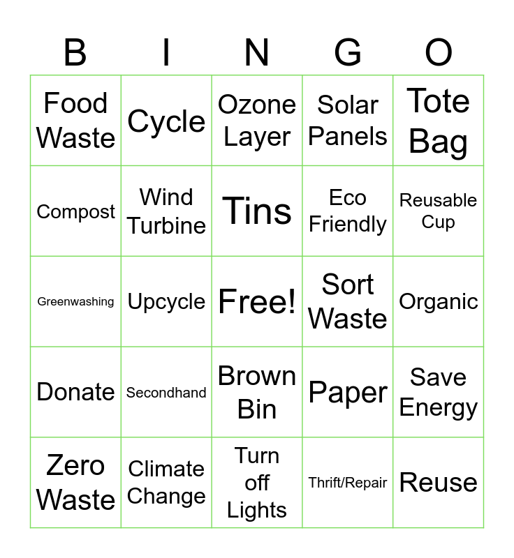 This bingo card has a free space and 48 words: Reduce, Reuse, Recycle, Turn off Lights, Secondhand, Walk, Cycle, Carpool, Compost, Reusable Bag, Wind Turbine, Solar Panels, Save Energy, Paper, Cardboard, Glass, Tins, Sort Waste, Litter Pick, Tote Bag, Upcycle, Thrift/Repair, Food Waste, Eco Friendly, Sustainable, Reusable Cup, Zero Waste, Green Bin, Brown Bin, Donate, Wildlife, Conservation, Public Transport, Climate Action, Climate Change, Global Warming, Green Energy, Organic, Low Waste, Clean Air, Refill, Plant Trees, Ozone Layer, Carbon Footprint, Greenwashing, Rising Sea Levels, Biodiversity Loss and Biodegradable.