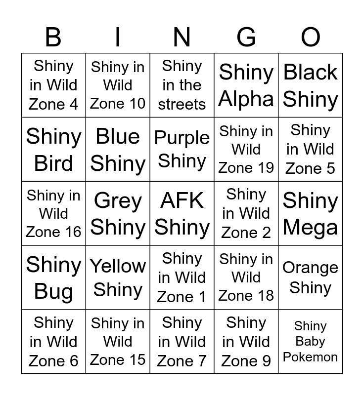 This bingo card has a free space and 37 words: Pink Shiny, Red Shiny, Green Shiny, Blue Shiny, Orange Shiny, Yellow Shiny, Purple Shiny, White Shiny, Black Shiny, Brown Shiny, Grey Shiny, Shiny Alpha, Shiny Baby Pokemon, Shiny Mega, Shiny Bird, Shiny Bug, Shiny on a roof, Shiny in the streets, Shiny in Wild Zone 1, Shiny in Wild Zone 2, Shiny in Wild Zone 4, Shiny in Wild Zone 5, Shiny in Wild Zone 6, Shiny in Wild Zone 7, Shiny in Wild Zone 8, Shiny in Wild Zone 9, Shiny in Wild Zone 10, Shiny in Wild Zone 11, Shiny in Wild Zone 12, Shiny in Wild Zone 13, Shiny in Wild Zone 14, Shiny in Wild Zone 15, Shiny in Wild Zone 16, Shiny in Wild Zone 17, Shiny in Wild Zone 18, Shiny in Wild Zone 19 and Shiny in Wild Zone 20.