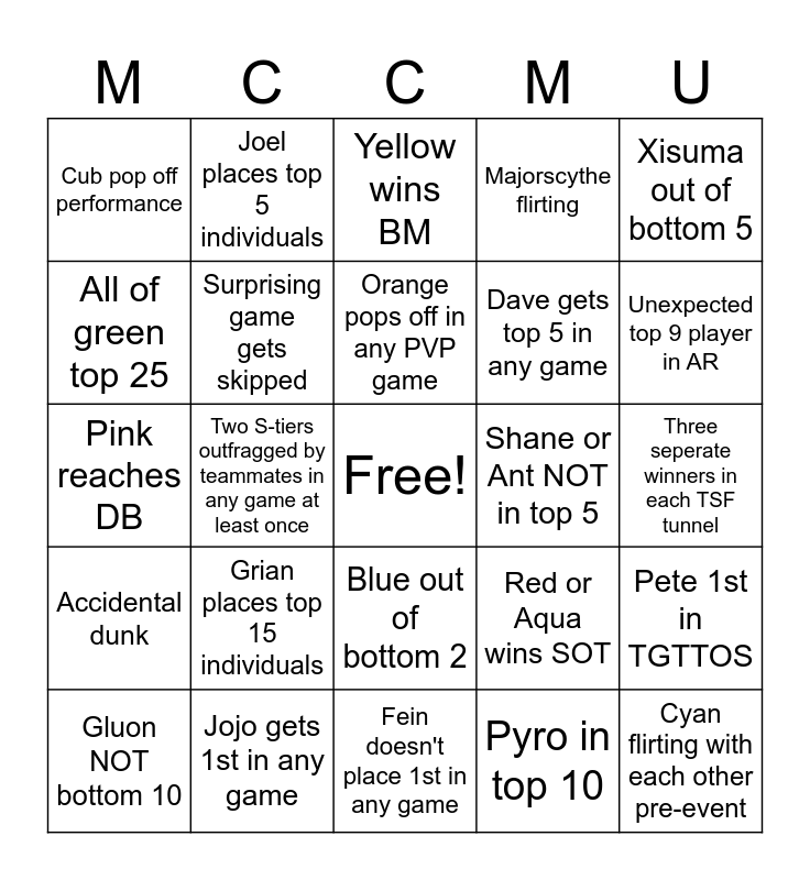 This bingo card has a free space and 24 words: Grian places top 15 individuals, Jojo gets 1st in any game, Orange pops off in any PVP game, Gluon NOT bottom 10, Xisuma out of bottom 5, Cub pop off performance, All of green top 25, Joel places top 5 individuals, Shane or Ant NOT in top 5, Blue out of bottom 2, Dave gets top 5 in any game, Pink reaches DB, Red or Aqua wins SOT, Pete 1st in TGTTOS, Surprising game gets skipped, Pyro in top 10, Three seperate winners in each TSF tunnel, Yellow wins BM, Unexpected top 9 player in AR, Two S-tiers outfragged by teammates in any game at least once, Cyan flirting with each other pre-event, Accidental dunk, Majorscythe flirting and Fein doesn't place 1st in any game.