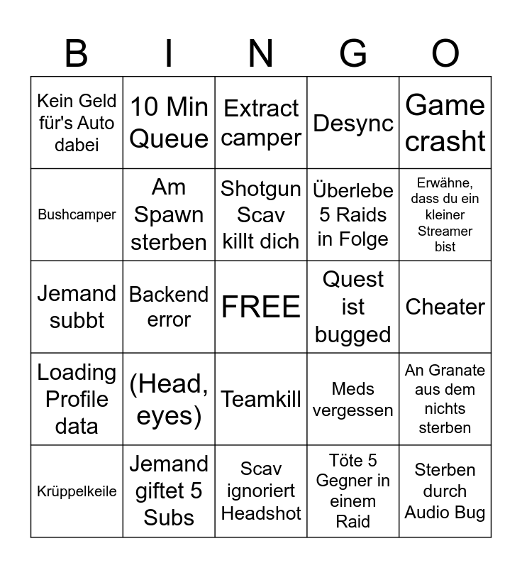 This bingo card has a free space and 24 words: (Head, eyes), Jemand giftet 5 Subs, Shotgun Scav killt dich, Krüppelkeile, Game crasht, Kein Geld für's Auto dabei, Bushcamper, 10 Min Queue, Quest ist bugged, Teamkill, Überlebe 5 Raids in Folge, Jemand subbt, Meds vergessen, An Granate aus dem nichts sterben, Am Spawn sterben, Töte 5 Gegner in einem Raid, Cheater, Extract camper, Erwähne, dass du ein kleiner Streamer bist, Backend error, Sterben durch Audio Bug, Loading Profile data, Desync and Scav ignoriert Headshot.