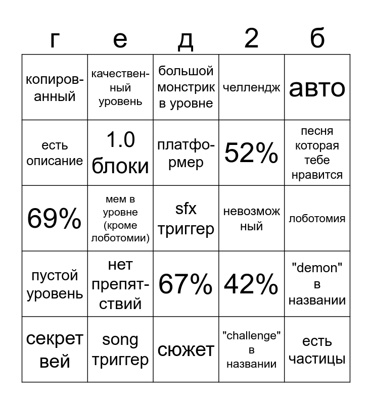 This bingo card has 25 words: нет препят- ствий, сюжет, платфо- рмер, секрет вей, авто, копиров- анный, есть описание, качествен- ный уровень, невозмож ный, 67%, 52%, 69%, 42%, "demon" в названии, 1.0 блоки, есть частицы, лоботомия, большой монстрик в уровне, песня которая тебе нравится, мем в уровне (кроме лоботомии), sfx триггер, song триггер, пустой уровень, челлендж and "challenge" в названии.