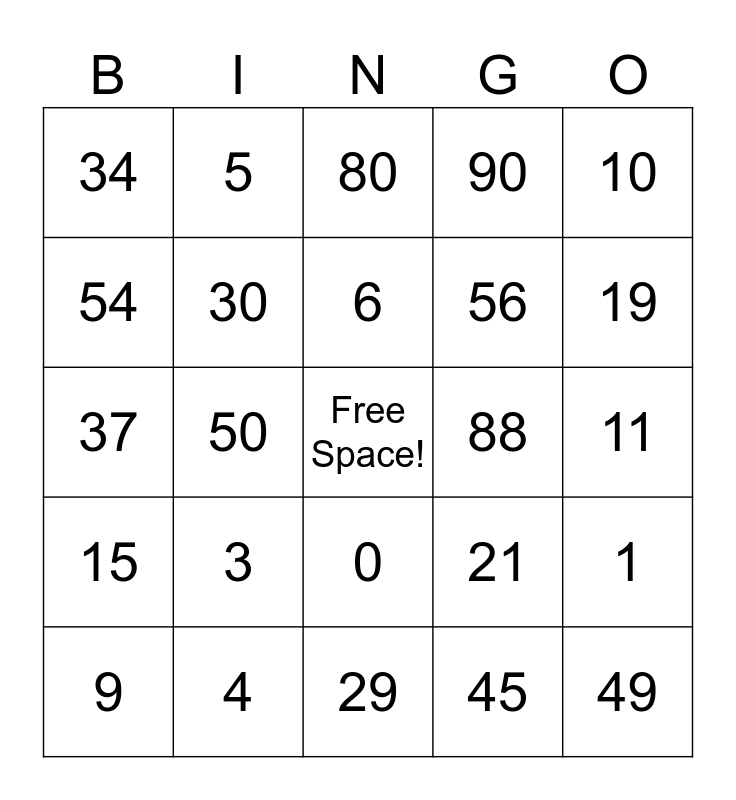 This bingo card has a free space and 24 words: 3, 4, 6, 9, 10, 34, 54, 5, 88, 0, 56, 37, 21, 1, 30, 45, 11, 80, 19, 50, 49, 15, 90 and 29.