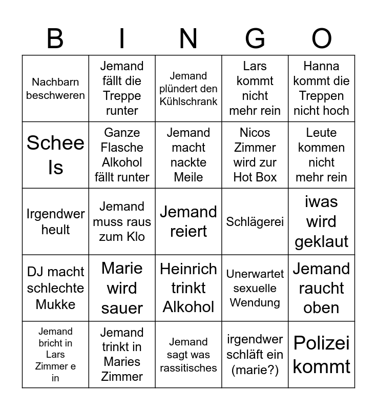 This bingo card has a free space and 24 words: Jemand bricht in Lars Zimmer ein, Marie wird sauer, Jemand macht nackte Meile, irgendwer schläft ein (marie?), Hanna kommt die Treppen nicht hoch, Nachbarn beschweren, Jemand fällt die Treppe runter, Jemand plündert den Kühlschrank, Schlägerei, iwas wird geklaut, Irgendwer heult, Ganze Flasche Alkohol fällt runter, Unerwartet sexuelle Wendung, Jemand raucht oben, Schee Is, Jemand trinkt in Maries Zimmer, Jemand sagt was rassitisches, Lars kommt nicht mehr rein, Leute kommen nicht mehr rein, DJ macht schlechte Mukke, Jemand muss raus zum Klo, Heinrich trinkt Alkohol, Nicos Zimmer wird zur Hot Box and Polizei kommt.