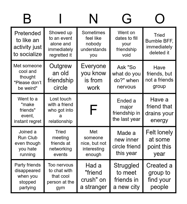 This bingo card has a free space and 24 words: Tried meeting friends at networking events, Too nervous to chat with that cool person at the gym, Everyone you know is from work, Party friends disappeared when you stopped partying, Tried Bumble BFF, immediately deleted it, Pretended to like an activity just to socialize, Met someone cool and thought "Please don’t be weird", Showed up to an event alone and immediately regretted it, Ended a major friendship in the last year, Met someone nice, but not interesting enough, Ask "So what do you do?" when nervous, Went to a "make friends" event, instant regret, Made a new inner circle friend this year, Felt lonely at some point this year, Outgrew an old friendship circle, Struggled to meet friends in a new city, Have a friend that drains your energy, Sometimes feel like nobody understands you, Have friends, but not a friends group, Lost touch with a friend who got into a relationship, Created a group to find your people, Joined a Run Club even though you hate running, Went on dates to fill your friendship void and Had a "friend crush" on a stranger.