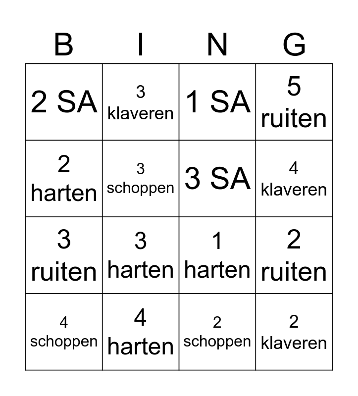 This bingo card has 19 words: 1 harten, 1 schoppen, 1 SA, 2 klaveren, 2 ruiten, 2 harten, 2 schoppen, 2 SA, 3 klaveren, 3 ruiten, 3 harten, 3 schoppen, 3 SA, 4 harten, 4 schoppen, 5 klaveren, 5 ruiten, 4 klaveren and 4 ruiten.