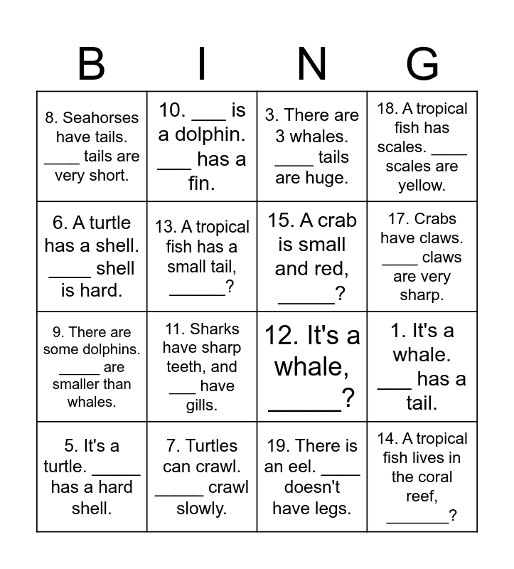 This bingo card has 20 words: 1. It's a whale. ___ has a tail., 2. A whale has a tail. ____ tail is huge., 3. There are 3 whales. ____ tails are huge., 4. There are 3 whales. _____ like jumping out of the ocean., 5. It's a turtle. _____ has a hard shell., 6. A turtle has a shell. ____ shell is hard., 7. Turtles can crawl. _____ crawl slowly., 8. Seahorses have tails. ____ tails are very short., 9. There are some dolphins. _____ are smaller than whales., 10. ___ is a dolphin. ___ has a fin., 11. Sharks have sharp teeth, and ___ have gills., 12. It's a whale, _____?, 13. A tropical fish has a small tail, ______?, 14. A tropical fish lives in the coral reef, _______?, 15. A crab is small and red, _____?, 16. Crabs are small. _____ have claws., 17. Crabs have claws. ____ claws are very sharp., 18. A tropical fish has scales. ____ scales are yellow., 19. There is an eel. ____ doesn't have legs. and 20. Eels are food. _____ are delicious..