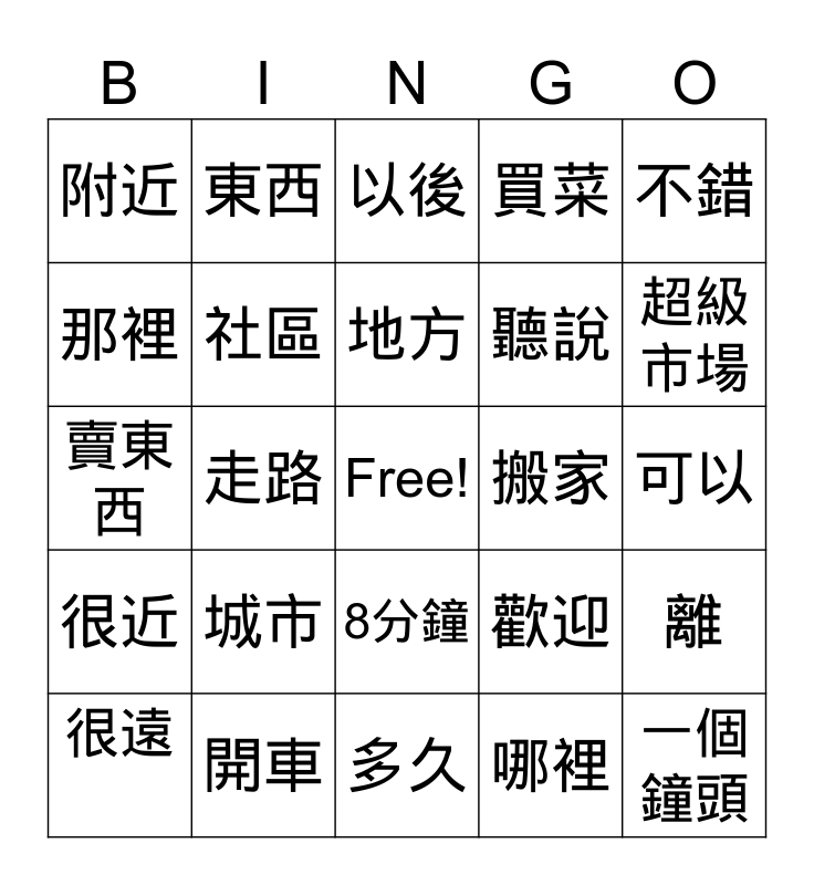 This bingo card has a free space and 28 words: 離, 從..到, 聽說, 哪裡, 那裡, 以後, 東西, 很近, 搬家, 很遠, 賣東西, 買菜, 開車, 多久, 超級市場, 游泳池, 城市, 社區, 地方, 8分鐘, 附近, 方便, 一個鐘頭, 走路, 可以, 歡迎, 不錯 and 便宜.
