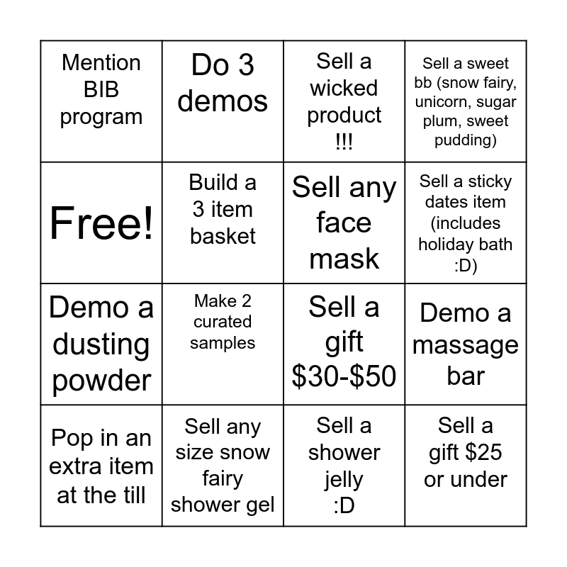 This bingo card has 16 words: Sell any size snow fairy shower gel, Demo a massage bar, Sell a wicked product !!!, Mention BIB program, Demo a dusting powder, Do 3 demos, Sell a gift $30-$50, Sell a shower jelly :D, Free!, Build a 3 item basket, Pop in an extra item at the till, Sell a sweet bb (snow fairy, unicorn, sugar plum, sweet pudding), Make 2 curated samples, Sell a sticky dates item (includes holiday bath :D), Sell any face mask and Sell a gift $25 or under.