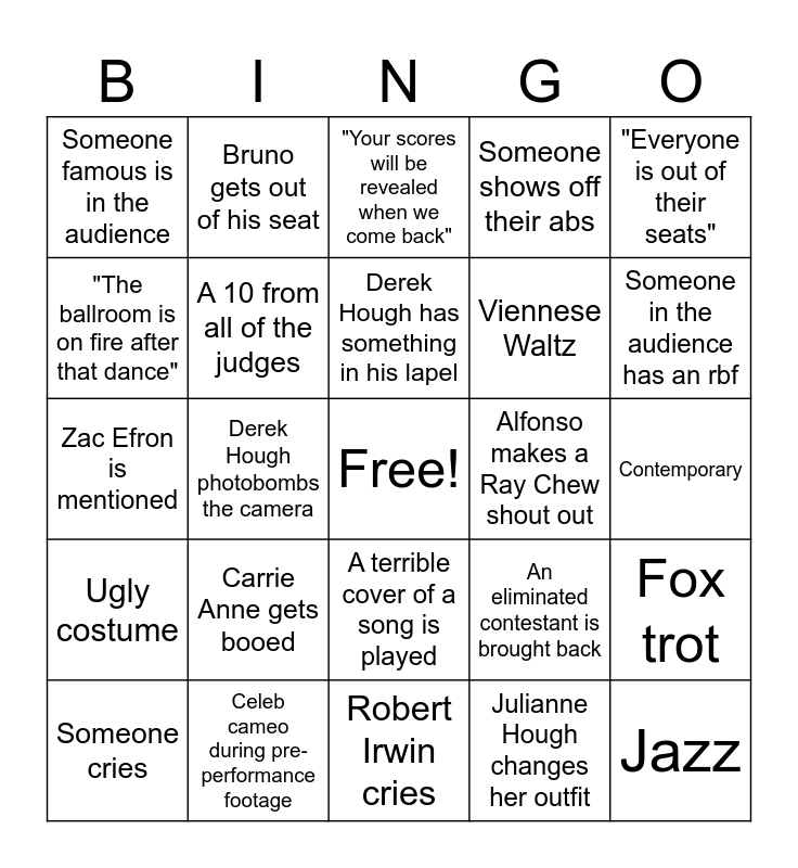 This bingo card has a free space and 24 words: Carrie Anne gets booed, Celeb cameo during pre-performance footage, Derek Hough has something in his lapel, Someone cries, "Everyone is out of their seats", Someone famous is in the audience, "The ballroom is on fire after that dance", Bruno gets out of his seat, Alfonso makes a Ray Chew shout out, A terrible cover of a song is played, Viennese Waltz, Zac Efron is mentioned, An eliminated contestant is brought back, Fox trot, A 10 from all of the judges, Julianne Hough changes her outfit, Contemporary, "Your scores will be revealed when we come back", Someone in the audience has an rbf, Derek Hough photobombs the camera, Jazz, Ugly costume, Someone shows off their abs and Robert Irwin cries.