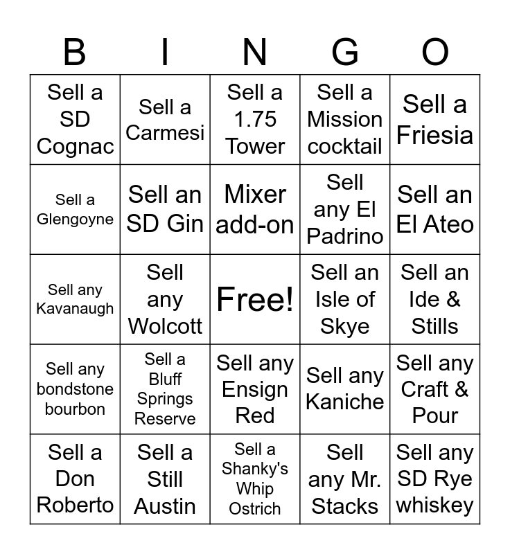 This bingo card has a free space and 24 words: Sell a Bluff Springs Reserve, Sell a Still Austin, Mixer add-on, Sell a Don Roberto, Sell a Friesia, Sell a SD Cognac, Sell a Glengoyne, Sell a Carmesi, Sell an Isle of Skye, Sell any Ensign Red, Sell any El Padrino, Sell any Kavanaugh, Sell any Kaniche, Sell any Craft & Pour, Sell an SD Gin, Sell any Mr. Stacks, Sell an Ide & Stills, Sell a 1.75 Tower, Sell an El Ateo, Sell any Wolcott, Sell any SD Rye whiskey, Sell any bondstone bourbon, Sell a Mission cocktail and Sell a Shanky's Whip Ostrich.