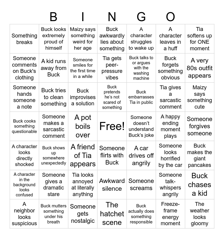 This bingo card has a free space and 121 words: Buck’s car backfires, Buck’s car makes a weird noise, Someone looks horrified by the car, Buck wears his giant coat, Buck lights a cigar, Someone comments on Buck’s lifestyle, Buck awkwardly lies about something, Tia rolls her eyes, Tia gives a sarcastic comment, Tia looks annoyed at literally anything, Tia talks to Bug, Buck mentions Bug in a threatening tone, Anyone mentions Bug’s name, Buck interrogates Bug, The drill scene, The hatchet scene, Buck pretends he’s not scared of something, Buck genuinely IS scared of something, Buck gives "parenting" but in the wrong way, Buck gives GREAT parenting advice but by accident, Maizy says something cute, Maizy says something weird for her age, Miles asks a super serious adult question, Miles interviews someone like a reporter, Buck makes a huge mess, Buck tries to clean something, Buck cooks something questionable, Buck makes the giant pancakes, The giant pancake flip, The kitchen looks chaotic, A pot boils over, Buck talks to or argues with the washing machine, Someone comments on Buck's clothing, Someone judges Buck silently, A neighbor looks suspicious, Buck embarrasses Tia, Tia gets mad at Buck over something small, Someone slams a door, Someone talk-whispers angrily, The kids run through the house, Buck shows up somewhere unexpectedly, The car backfires at the worst possible moment, Buck mutters something under his breath, Buck makes a dry joke, Someone doesn’t understand Buck’s joke, Buck acts offended but he’s not, Awkward silence, A very 80s outfit appears, Someone’s hairstyle is aggressively 80s, Someone gives a dramatic stare, Someone says “Uncle Buck!” in disbelief, Anyone says Buck’s full name, Buck embarrasses Tia in public, Someone mentions school, The principal scene, Buck insults the principal (the iconic line), Someone gasps, Someone drops something, Buck looks completely confused, Buck looks extremely proud of himself, A character looks directly shocked, Someone gets emotional but hides it, Someone apologizes reluctantly, A phone call interrupts something, A misunderstanding causes chaos, A character leaves in a huff, Someone storms outside, The weather looks gloomy, A car drives off angrily, A friend of Tia appears, Tia gets peer-pressure vibes, Buck warns Tia about boys, Buck gives a dramatic speech, Someone ignores Buck, Someone laughs awkwardly, A kid runs away from Buck, Buck chases a kid, Buck gets winded from doing something simple, Buck makes a face after hearing bad news, Buck forgets something obvious, Buck improvises a solution, Something breaks, Buck steps on something, A door creaks loudly, Someone screams, A teacher looks stern, A classroom looks depressing, Buck gets judged by school staff, Someone hands someone a note, Buck tries to flirt (awkwardly), Someone flirts with Buck, Buck gets embarrassed, Someone makes a sarcastic comment, A character wears patterns that hurt your eyes, A character in the background looks confused, Someone knocks something over, A loud noise startles everyone, A character falls asleep, A character struggles to wake up, Breakfast chaos, Someone spills a drink, Kids laugh at Buck, Buck tells a wild story, Buck lies and everyone knows it, Tia softens up for ONE moment, Someone hugs Buck, Buck actually does something responsible, Someone cheers for Buck, Someone mentions the parents, Someone misses the parents, Someone gets nostalgic, Tia has a revelation moment, A character apologizes sincerely, Someone forgives someone, A happy ending moment plays, Someone smiles for the first time in a while, Buck does something surprisingly heroic, A dramatic 80s music moment plays, Freeze-frame energy moment, Classic John Hughes vibe and The movie ends abruptly like many 80s movies.
