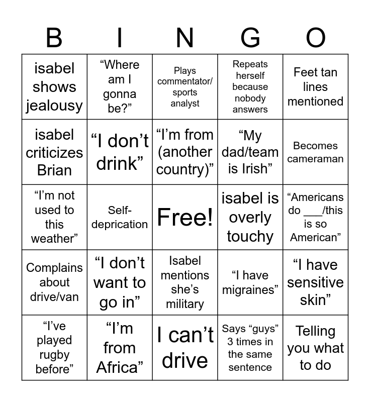 This bingo card has a free space and 24 words: “I don’t want to go in”, “I’m from Africa”, “I’m from (another country)”, “I’ve played rugby before”, Feet tan lines mentioned, isabel shows jealousy, isabel criticizes Brian, “Where am I gonna be?”, isabel is overly touchy, Isabel mentions she’s military, “My dad/team is Irish”, “I’m not used to this weather”, “I have migraines”, “I have sensitive skin”, “I don’t drink”, Says “guys” 3 times in the same sentence, “Americans do ___/this is so American”, Plays commentator/ sports analyst, Becomes cameraman, Self-deprication, Telling you what to do, Complains about drive/van, Repeats herself because nobody answers and I can’t drive.