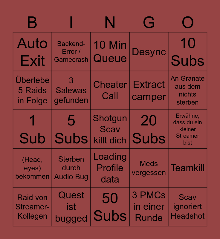 This bingo card has 25 words: (Head, eyes) bekommen, Quest ist bugged, Shotgun Scav killt dich, 3 PMCs in einer Runde, 10 Subs, Auto Exit, Backend- Error / Gamecrash, 10 Min Queue, 20 Subs, Teamkill, Überlebe 5 Raids in Folge, 3 Salewas gefunden, 50 Subs, Meds vergessen, An Granate aus dem nichts sterben, Raid von Streamer-Kollegen, 5 Subs, Cheater Call, Extract camper, Erwähne, dass du ein kleiner Streamer bist, 1 Sub, Sterben durch Audio Bug, Loading Profile data, Desync and Scav ignoriert Headshot.