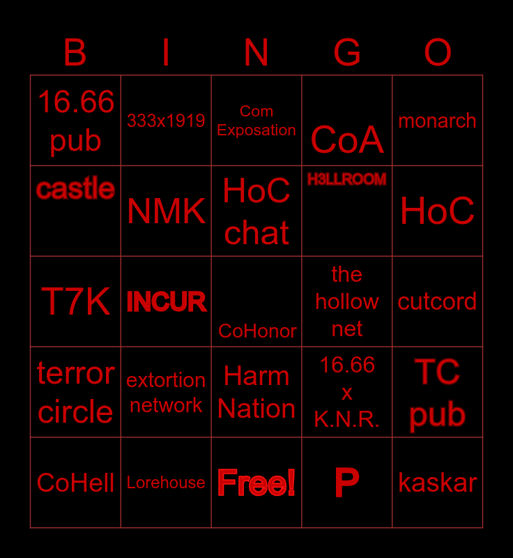 This bingo card has 25 words: terror circle, Lorehouse, CoHonor, P, monarch, 16.66 pub, 333x1919, Com Exposation, the hollow net, TC pub, castle, NMK, Free!, 16.66 x K.N.R., HoC, CoHell, INCUR, HoC chat, H3LLROOM, cutcord, T7K, extortion network, Harm Nation, CoA and kaskar.