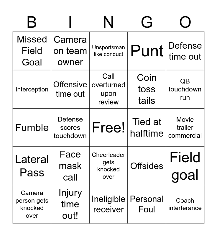 This bingo card has a free space and 24 words: Face mask call, Injury time out!, Call overturned upon review, Camera person gets knocked over, Defense time out, Missed Field Goal, Interception, Camera on team owner, Tied at halftime, Cheerleader gets knocked over, Coin toss tails, Fumble, Offsides, Field goal, Offensive time out, Personal Foul, Movie trailer commercial, Unsportsman like conduct, QB touchdown run, Defense scores touchdown, Coach interferance, Lateral Pass, Punt and Ineligible receiver.
