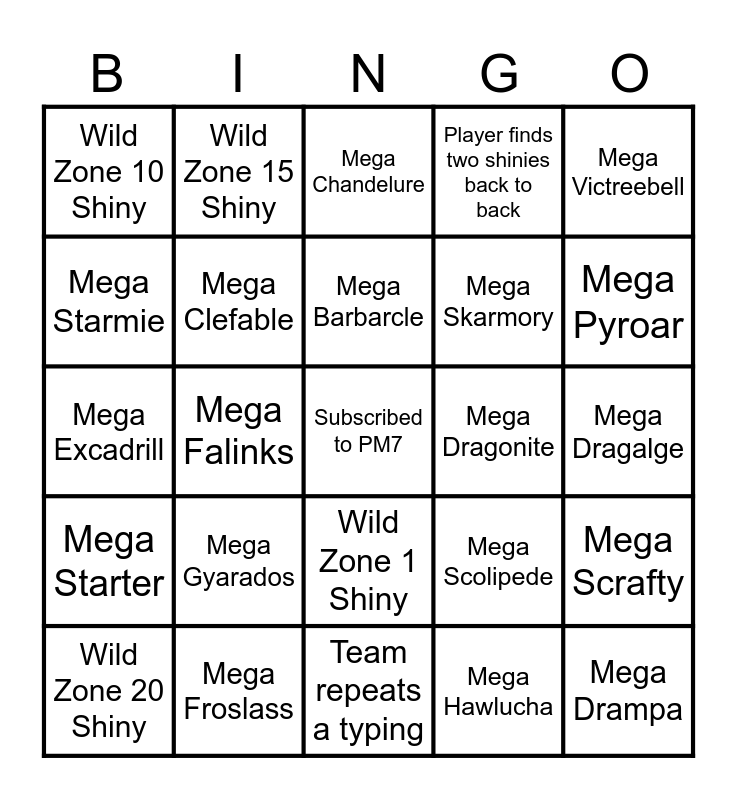 This bingo card has a free space and 24 words: Mega Gyarados, Mega Froslass, Mega Barbarcle, Wild Zone 20 Shiny, Mega Victreebell, Wild Zone 10 Shiny, Mega Starmie, Wild Zone 15 Shiny, Mega Dragonite, Wild Zone 1 Shiny, Mega Skarmory, Mega Excadrill, Mega Scolipede, Mega Scrafty, Mega Clefable, Mega Hawlucha, Mega Dragalge, Mega Chandelure, Mega Pyroar, Mega Falinks, Mega Drampa, Mega Starter, Player finds two shinies back to back and Team repeats a typing.