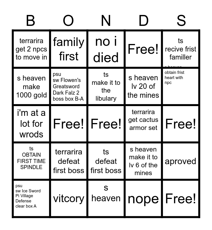 This bingo card has a free space and 39 words: psu hg H10 Missouri MAG clear box Easy, psu sb True Agito MAG clear box Very Hard, psu sb Frying Pan De Ragan boss box A, psu sw Flowen's Greatsword Dark Falz 2 boss box B-A, psu sw Ice Sword Pi Village Defense clear box A, ts defeat first boss, ts make it to the libulary, ts stop time for the frist time, ts recive frist familler, ts OBTAIN FIRST TIME SPINDLE, Free!, Free!, Free!, Free!, terrarira get cactus armor set, terrarira defeat first boss, terrarira obtain a magic weapon, terrarira get 2 npcs to move in, terrarira open your frist chest, s heaven make it to lv 6 of the mines, s heaven make 1000 gold, s heaven, s heaven lv 20 of the mines, s heaven obtain frist heart with npc, teamwork, healer, no whining, we don't quit, bonds rules, family first, no did i really, don't do that it's weird, no i died, vitcory, nope, denined, aproved, i'm at a lot for wrods and tep i'm done.