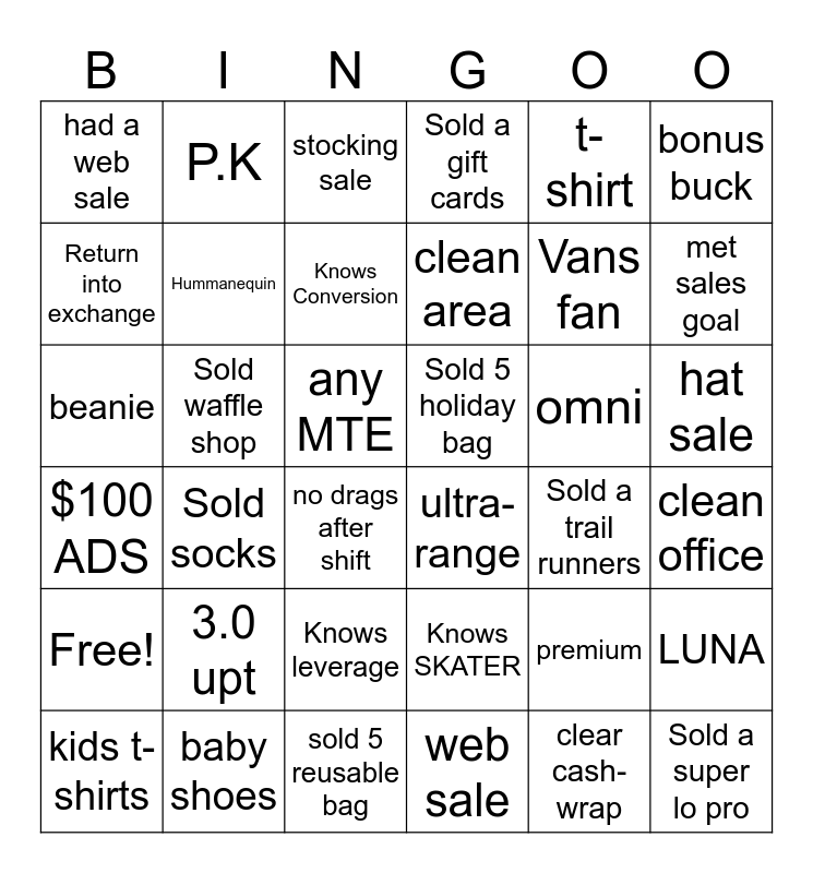 This bingo card has 38 words: $100 ADS, 3.0 upt, sold 5 reusable bag, clean area, omni, hat sale, had a web sale, baby shoes, Knows Conversion, Sold 5 holiday bag, Vans fan, met sales goal, beanie, Hummanequin, any MTE, ultra-range, premium, bonus buck, Free!, P.K, stocking sale, Knows SKATER, t-shirt, LUNA, kids t-shirts, Sold socks, Knows leverage, web sale, clear cash-wrap, Sold a super lo pro, RFID, Sold waffle shop, no drags after shift, Sold a gift cards, Sold a trail runners, clean office, Return into exchange and SURVEY.
