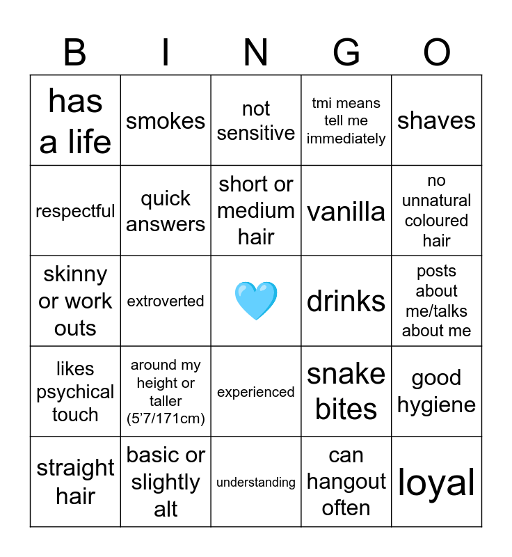 This bingo card has a free space and 24 words: around my height or taller (5’7/171cm), basic or slightly alt, short or medium hair, straight hair, shaves, has a life, respectful, smokes, drinks, experienced, vanilla, skinny or work outs, snake bites, good hygiene, quick answers, can hangout often, posts about me/talks about me, not sensitive, no unnatural coloured hair, extroverted, loyal, likes psychical touch, tmi means tell me immediately and understanding.