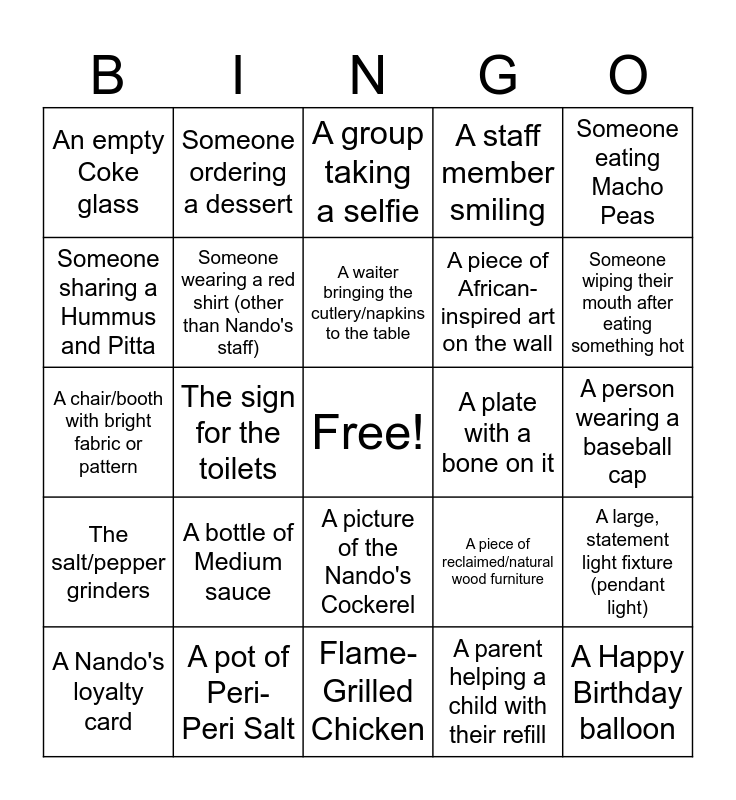 This bingo card has a free space and 24 words: A bottle of Medium sauce, A pot of Peri-Peri Salt, A waiter bringing the cutlery/napkins to the table, A Nando's loyalty card, Someone eating Macho Peas, An empty Coke glass, Someone sharing a Hummus and Pitta, Someone ordering a dessert, A plate with a bone on it, A picture of the Nando's Cockerel, A piece of African-inspired art on the wall, A chair/booth with bright fabric or pattern, A piece of reclaimed/natural wood furniture, A large, statement light fixture (pendant light), Someone wearing a red shirt (other than Nando's staff), A parent helping a child with their refill, A person wearing a baseball cap, A group taking a selfie, Someone wiping their mouth after eating something hot, The sign for the toilets, A Happy Birthday balloon, The salt/pepper grinders, A staff member smiling and Flame-Grilled Chicken.