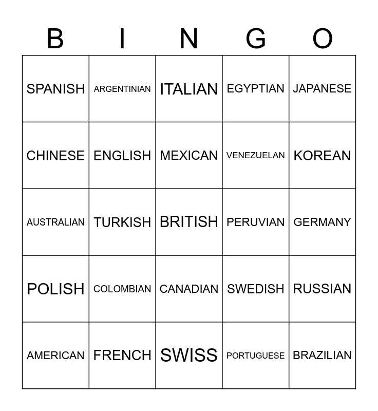 This bingo card has a free space and 24 words: COLOMBIAN, FRENCH, MEXICAN, AMERICAN, JAPANESE, SPANISH, CHINESE, ARGENTINIAN, PERUVIAN, CANADIAN, VENEZUELAN, AUSTRALIAN, SWEDISH, RUSSIAN, ENGLISH, PORTUGUESE, GERMANY, ITALIAN, KOREAN, TURKISH, BRAZILIAN, POLISH, EGYPTIAN and SWISS.