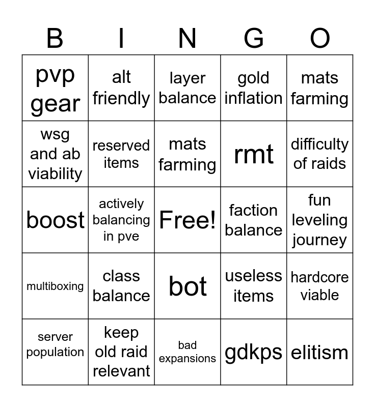 This bingo card has a free space and 24 words: class balance, keep old raid relevant, mats farming, server population, mats farming, pvp gear, wsg and ab viability, alt friendly, faction balance, bot, rmt, boost, useless items, hardcore viable, reserved items, gdkps, fun leveling journey, layer balance, difficulty of raids, actively balancing in pve, elitism, multiboxing, gold inflation and bad expansions.