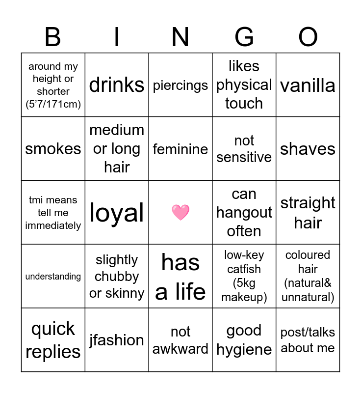 This bingo card has a free space and 24 words: slightly chubby or skinny, jfashion, feminine, quick replies, vanilla, around my height or shorter (5’7/171cm), smokes, drinks, can hangout often, has a life, not sensitive, tmi means tell me immediately, low-key catfish (5kg makeup), coloured hair (natural& unnatural), medium or long hair, good hygiene, straight hair, piercings, shaves, loyal, post/talks about me, understanding, likes physical touch and not awkward.