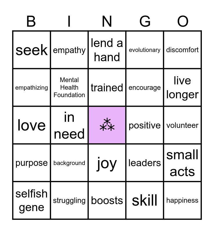 This bingo card has a free space and 54 words: overlooked, purpose, victim, fortune, joy, emotions, evolutionary, passion, empathizing, mental health, seek, hour, struggling, selfish gene, releases, boosts, happiness, encourage, CPR, volunteer, leaders, DNA, positive, discomfort, brain, empathy, favoritism, nieces, teach, skill, charity, sense, nap, community, lend a hand, opportunities, love, small acts, dramatic, Mental Health Foundation, confidence, happiness, kindness, genuine, background, assistance, family, friends, trained, in need, live longer, compliment, support and psychology.