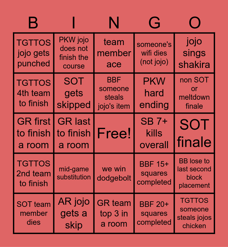This bingo card has a free space and 106 words: jojo mentions physically sweating, jojo pep talk, jojo sings shakira, jojo swears despite being pg team, jojo takes on a leadership role, jojo talks bad about herself, jojo beats her coin record (3681), jojo first place in a game, jojo gets targeted, jojo messes up egg throw, jojo shows her shaky hands, top 5 overall individual placement, team first place in a game, team first place overall, team gets dunked, team gets dunked 2+ times, team member ace, team receives a decision dome item, top 3 overall team placement, we make it to dodgebolt, we win dodgebolt, gain points from joker card, lose points from joker card, accidental void, audience votes for preferred game, mid-game substitution, non SOT or meltdown finale, someone's wifi dies (not jojo), tactical void (any team member), technical difficulties (not jojo), BBF 15+ squares completed, BBF 20+ squares completed, BBF 2 bingos, BBF diagonal bingo, BBF forgets crafting recipe, BBF full board completed, BBF leaves behind crafting table, BBF someone griefs jojo's progress, BBF someone steals jojo's item, BBF tactical death, BBF teleport to wrong teammate, BBF too slow to craft, TGTTOS 1st team to finish, TGTTOS 2nd team to finish, TGTTOS 3rd team to finish, TGTTOS 4th team to finish, TGTTOS jojo accidentally falls, TGTTOS jojo gets punched, TGTTOS jojo punches someone, TGTTOS someone steals jojos chicken, AR jojo fastest lap, AR jojo gets a skip, AR jojo misses a skip, AR jojo misses jump pad, AR jojo notices elytra/trident issue, AR jojo serenades us, AR jojo top 5, PKW "aah i slipped", PKW finish before overtime, PKW jojo does not finish the course, PKW less than 30s remaining, PKW less than 60s remaining, PKW jojo does every bonus section, PKW jojo mentions bumping her shoulder, PKW jojo mentions her toe missing the block, PKW jojo says the timing jumps are hard, PKW jojo skips a bonus section, PKW medium ending, PKW hard ending, GR first to finish a room, GR last to finish a room, GR team top 3 in a room, GR team top 3 in 3+ rooms, GR jojo says boyoyoys, GR redstone placement room, BM 1 gold build, BM 2 gold builds, BM 3+ gold builds, BM 3+ regular builds, BM 5+ regular builds, BM misplace a block by one, BM more than 50% completed at end, BM not skipped, BM skipped, SB 3+ kills overall, SB 5+ kills overall, SB 7+ kills overall, SB accidental void, SB bow snipe someone while bridging, SB jojo dies to fall damage, SB last team standing, BB jojo 10+ kills overall, BB jojo 5+ kills overall, BB jojo ace, BB lose round from wool rush, BB lose to last second block placement, BB win round from wool rush, BB win to last second block placement, SOT blue vault, SOT finale, SOT gets skipped, SOT gold vault, SOT green vault, SOT red vault, SOT team member dies and SOT team member gets locked in.