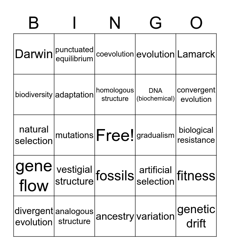 This bingo card has a free space and 24 words: vestigial structure, analogous structure, homologous structure, divergent evolution, Lamarck, Darwin, biodiversity, punctuated equilibrium, gradualism, fossils, DNA (biochemical), natural selection, artificial selection, fitness, adaptation, variation, biological resistance, coevolution, convergent evolution, mutations, genetic drift, gene flow, evolution and ancestry.