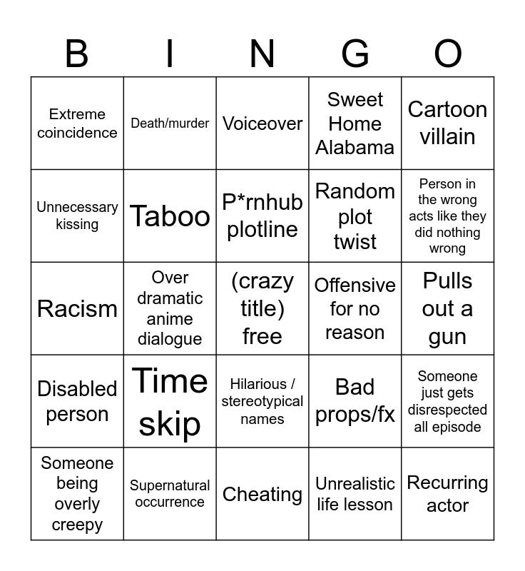 This bingo card has a free space and 24 words: Someone being overly creepy, Time skip, P*rnhub plotline, Unrealistic life lesson, Cartoon villain, Extreme coincidence, Death/murder, Voiceover, Offensive for no reason, Pulls out a gun, Racism, Taboo, Bad props/fx, Someone just gets disrespected all episode, Unnecessary kissing, Supernatural occurrence, Cheating, Sweet Home Alabama, Person in the wrong acts like they did nothing wrong, Disabled person, Over dramatic anime dialogue, Hilarious / stereotypical names, Random plot twist and Recurring actor.