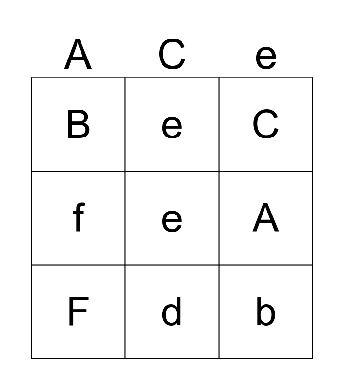 This bingo card has a free space and 8 words: A, C, e, F, B, b, f and d.