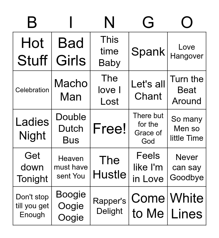 This bingo card has a free space and 24 words: Heaven must have sent You, Boogie Oogie Oogie, The love I Lost, Don't stop till you get Enough, Love Hangover, Hot Stuff, Celebration, Bad Girls, There but for the Grace of God, The Hustle, Let's all Chant, Ladies Night, Feels like I'm in Love, Never can say Goodbye, Macho Man, Come to Me, So many Men so little Time, This time Baby, Turn the Beat Around, Double Dutch Bus, White Lines, Get down Tonight, Spank and Rapper's Delight.