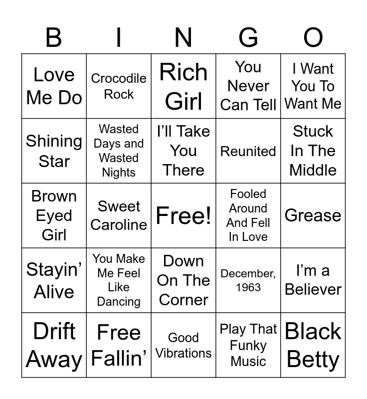 This bingo card has a free space and 44 words: Signed, Sealed, Delivered, Black Betty, My Girl, Drift Away, Come Together, Play That Funky Music, Rich Girl, Superstition, I Want You To Want Me, Free Fallin’, You Never Can Tell, Fooled Around And Fell In Love, Down On The Corner, You Make Me Feel Like Dancing, Brandy, Good Vibrations, Come On Eileen, Brown Eyed Girl, Right Back Where We Started From, Stuck In The Middle, Crocodile Rock, Don’t Go Breaking My Heart, Spirit In The Sky, Love Me Do, You’re The One That I Want, Grease, I Will Survive, Old Time Rock & Roll, December, 1963, Stayin’ Alive, Rosanna, I’m a Believer, Bad Moon Rising, Long Cool Woman (In a Black Dress), Sweet Caroline, Happy Together, Burning Love, Sugar, Sugar, I’ll Take You There, Shining Star, Reunited, Kiss and Say Goodbye, Wasted Days and Wasted Nights and Cotton Fields.