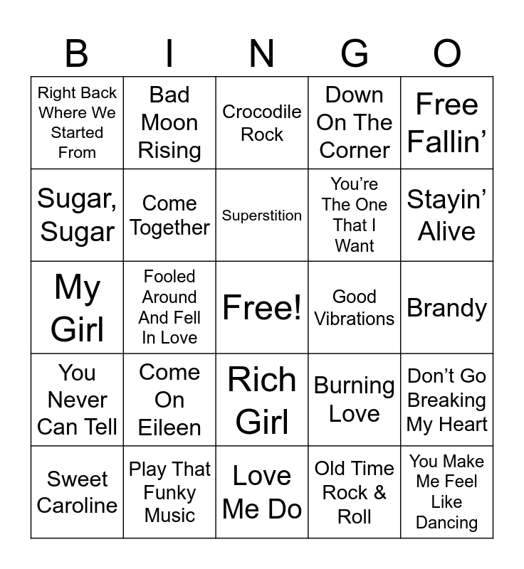 This bingo card has a free space and 41 words: Signed, Sealed, Delivered, My Girl, Drift Away, Come Together, Play That Funky Music, Rich Girl, Superstition, I Want You To Want Me, Free Fallin’, You Never Can Tell, Fooled Around And Fell In Love, Down On The Corner, You Make Me Feel Like Dancing, Brandy, Good Vibrations, Come On Eileen, Brown Eyed Girl, Right Back Where We Started From, Stuck In The Middle, Crocodile Rock, Don’t Go Breaking My Heart, Spirit In The Sky, Love Me Do, You’re The One That I Want, Grease, I Will Survive, Old Time Rock & Roll, December, 1963, Stayin’ Alive, Rosanna, I’m a Believer, Bad Moon Rising, Sweet Caroline, Happy Together, Burning Love, Sugar, Sugar, I’ll Take You There, Shining Star, Reunited, Kiss and Say Goodbye and Wasted Days and Wasted Nights.